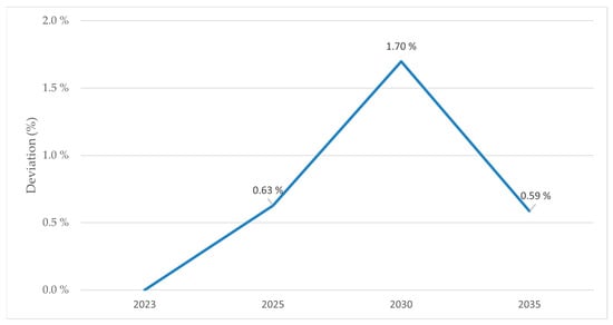The trajectory of power generation costs in each of the examined scenarios provides key insights into the subsequent socioeconomic implications. Figure 11 charts the potential evolution of the impact of the implementation of the ambitious scenario over the 2023–2035 period on the GDP of the Greek economy as a percentage deviation in relation to the NECP scenario. As shown, the rapid decarbonization of the power sector is, by and large, expected to have a positive impact on the GDP of the Greek economy. This impact follows a similar trajectory to that of the power generation costs (Figure 10). Particularly, until 2030, the impact on GDP is predicted to be increasingly positive as power generation costs steadily decline. Notably, in 2030, the GDP of the Greek economy could be 1.7% higher under the ambitious scenario compared to the NECP scenario. This can be attributed to the alleviation of power generation costs, which is associated with the expansion of the disposable income of households and the final demand, subsequently growing and broadening the economy.
