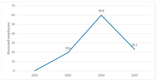 The positive impact on GDP becomes less profound in the post-2030 period when power generation costs begin to increase. However, even in 2035, the GDP of the Greek economy is expected to be 0.59% higher under the ambitious scenario compared with the trajectory involving fewer mitigation efforts. On average, the rapid decarbonization of the power sector can result in an annual enlargement of the GDP of the Greek economy by approximately 0.05% over the 2023–2035 period. Regarding the impact on employment in the Greek economy, it unfolds rather similarly to the impact on GDP. Figure 12 presents the effect of speedier decarbonization of the power sector on the employment in the Greek economy, as a deviation of one thousand employees compared to the NECP scenario.