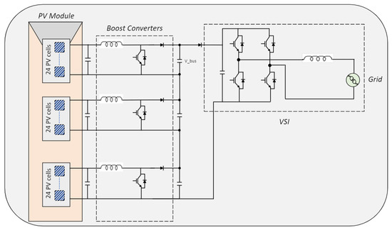 The presented structure aims to harvest the power from the shaded part of the PV module instead of isolating it from the PV module by employing a power electronic boost converter with each SM. The purpose of the boost converter is to obtain the maximum available power from each PV cell group. Boost converter has been chosen due to its capability to step up the low voltage at the PV SM side. Although the boost converter is designed to boost the input side voltage to a higher voltage at the output side, its boosting capability is limited to a specific output range. The output voltage of boost converters is connected in series to meet voltage requirements at the utility grid. Also, the proposed topology is designed to harvest the maximum power from the PV side with DC to AC inverting capability.