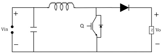The boost converter module is based on the circuit shown in Figure 3. The converter component is assumed to be ideal, and the component’s internal losses are neglected. The system equations are obtained using the general averaging method as follows: