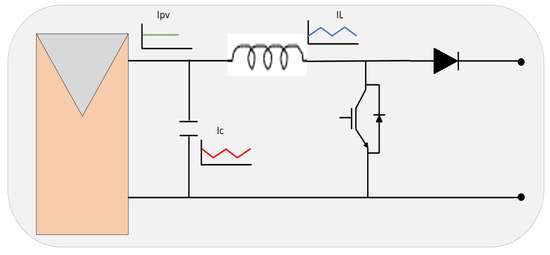 The input inductor value of the boost converter can determine the input current ripples. Obtaining the right value for the inductor of the boost converter can be calculated during the rising state when the boost converter’s switch is turned on. Under the assumption of constant input current from the PV SM, the capacitor current will be expressed by subtracting the PV SM input current from the boost converter inductor current. The waveform of the inductor current of the boost converter is assumed to be triangular; thus, the capacitor current will have the antiphase triangular waveform. Integrating the triangular area can equal the amount of charge stored in the capacitor. Figure 4 illustrates both the circuit and current waveforms of the PV SM boost converter. In a grid-tied inverter, the DCBUS capacitor value is selected according to the input and output power to buffer the second-order harmonic distortion of the proposed structure, and current-based derivation can be used to obtain the most proper value for the DCBUS capacitor. Proper selection of capacitor value can maintain pure DC power from the PV input and sinusoidal waveform current at the grid side. In the same concept, the DCBUS capacitor value can be selected with the assumption that a pure DC flows from cascaded boost converters. The grid current waveform shape is sinusoidal, which means the current flowing through the capacitor will be the same as the grid current; however, the capacitor current sign will be reversed in direction.