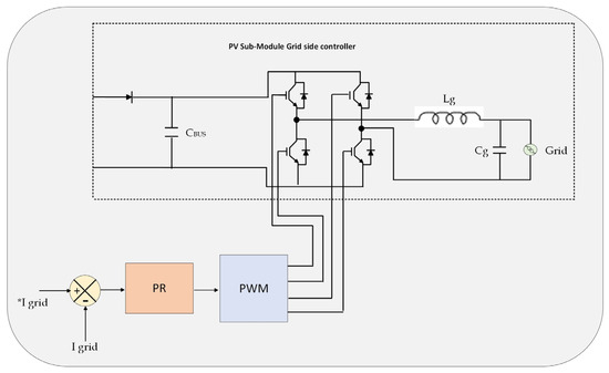 Usually, controlling the alternating current is based on converting the alternating current to constant values and then performing a controlling process by a conventional PID controller and converting it back to controlled alternating signals. This strategy has been used for years, and it can be appropriate for several applications; however, it requires several design stages, which might affect the performance of the controlling process. The Proportional Resonant (PR) controller has been used in several applications to control alternating signals, and its validity has been proven. The PR controller is used in this study to control the grid current to maintain a sinusoidal current waveform at the grid side. The controlling strategy used in this study is based on sensing the grid current and comparing it with the desired value to calculate the error between the two signals. This will pass through the PR controller, which performs the control process and tracks the sinusoidal referenced grid signal. The block diagram of the controller for the proposed topology is illustrated in Figure 10.