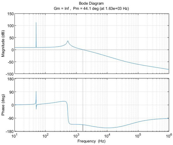 where is the proportional gai; and are resonant gain and frequency, respectively. The conventional PID controller is suitable for systems with constant values, such as DC-DC converters, and it can eliminate steady-state errors and provide fast response. However, the PID controller cannot track sinusoidal waveforms. The PR controller can provide an infinite gain at a selected frequency; thus, it is commonly used in grid-connected inverters. The grid side of the proposed system can be represented by an LC filter, as illustrated in Figure 11. The bode plot of the PR controller used in this study is shown in Figure 12.