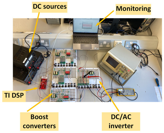 The experimental setup for obtaining the maximum available power from the three SMs inside an individual PV module is shown in Figure 13. Each PVSM is rated at 250 W; thus, the maximum available power from a PV module is rated at 750 W. The system is controlled by the Texas Instrument Digital Signal Processor (TMS320F28335), which is used to control the gate signals for the three boost converters at the input side. DC power supplies are used to mimic the PVSM. The PV module output is linked to the utility grid through an autotransformer, which steps down the grid voltage from 240 V to 100 V. The three PV SMs are connected to three separate DC power sources, mimicking the PV module. The output DC power from the PV module is inverted to a Low Voltage AC grid (LV AC) to examine the validity of the proposed topology.
