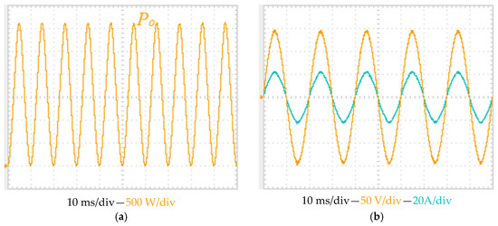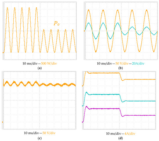 Experimental results of the proposed microinverter with a 50% drop in the output power. (a) Total output power of the system; (b) The grid voltage and current; (c) dc-link voltage; and (d) SMs input current.