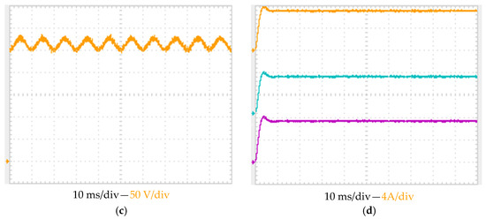 The experimental results of the suggested topology for employing the DMPPT at the PVSM level are shown in Figure 14. Figure 14a shows the total input power of the system. Figure 14b shows the output voltage and current when the power is injected into the grid through the autotransformer at unity power factor. Figure 14c shows the DC-link voltage between the PV SMs and the DC/AC inverter. Finally, Figure 14d shows the input currents of the PV SMs.