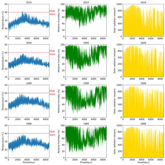 In Auroville, the climate data demonstrated high temperatures, humidity, and solar radiation throughout the year. The climate analysis (Figure 4) showed daily average temperature, relative humidity, and total solar radiation in Auroville in 1989, 1999, 2009 and 2019. According to the Indian Meteorological Department (IMD), a heatwave should be declared in a coastal area such as Auroville when the maximum temperature is at or above 40 °C [50]. The maximum recorded temperature in Auroville crossed 40 °C for ten days (21 h) during the summer of 2019 (Figure 4). The analysis of temperature changes in 1989–2019 showed that the heatwave threshold was regularly exceeded over the last six years of the data series; 13 days (45 h), seven days (25 h), six days (11 h), 10 days (36 h) and one day (4 h) in 2014, 2015, 2016, 2017 and 2018, respectively. Before 2014, the heatwave threshold was never exceeded. Over 10% and 35% of the annual hours showed RH values at or above 90% and 80%, respectively (Figure 4). Regarding RH and solar radiation, the last 30 years’ evolution did not significantly increase, but there was evidence of elevated ambient temperature and attendant heat waves in Auroville since 2014.