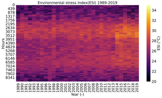 where is the ambient temperature (°C), the relative humidity (%), and the solar radiation (Wm−2); the output unit for ESI is °C. There were a significant number of studies that used ESI to analyse the climate in [41,42,43,44,45] along with different methods such as wet bulb globe temperature (WBGT) index, Temperature–humidity index (THI) and Heat index (HI).
