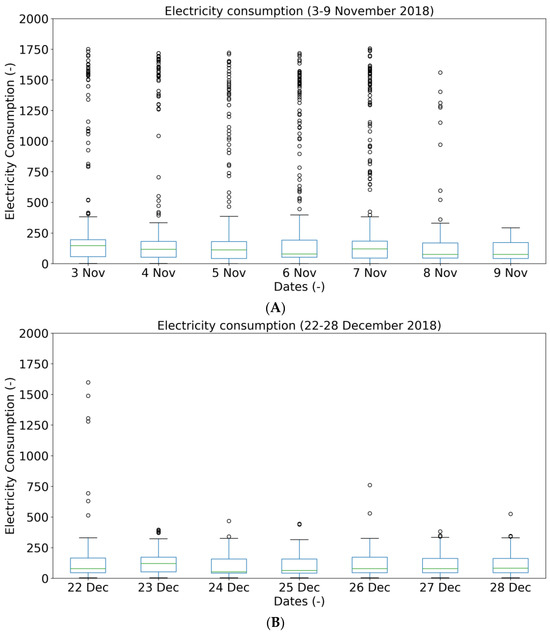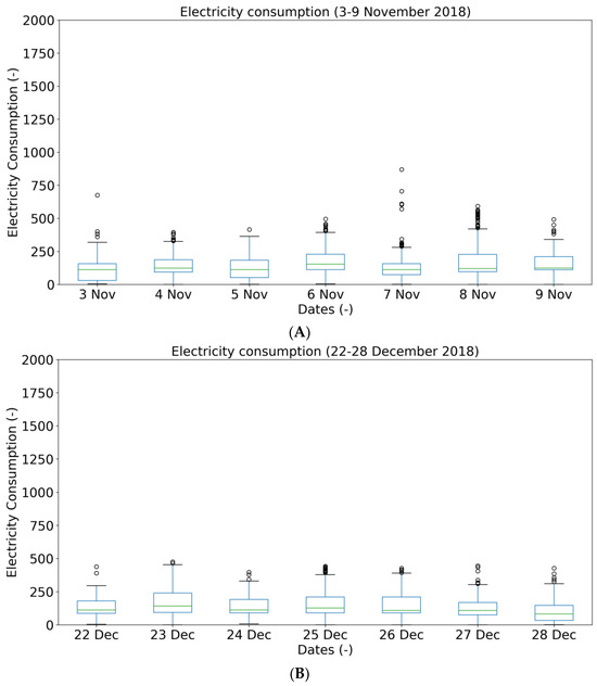 (A) Electricity consumption in 3–9 November 2018; (B) Electricity consumption in 22–28 December 2018.