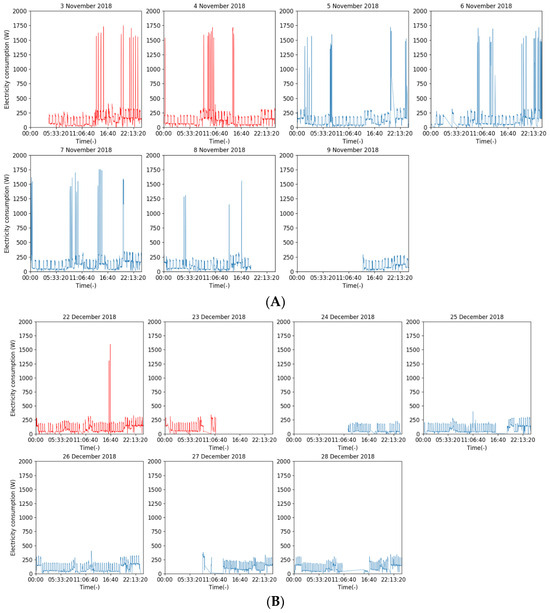 Daily electricity demand profile for ‘Home 5’ without A/C ((A) 3–9 November 2018, (B) 22–28 December 2018); Red and blue are for weekends and weekdays, respectively. The missing data may have been due to the reasons explained in Section 2.3.3.