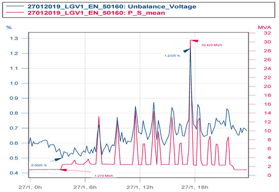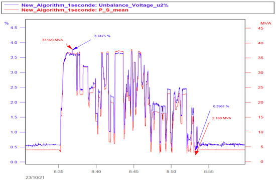 To verify the impact of the operating modes of high-speed trains (TGV) on the variation of the voltage imbalance rate, the proposed solution also allows for the recording of active, reactive, and apparent power, which will facilitate the analysis. To do this, it was necessary to overlay its graph in “blue” on that of the apparent power consumed in “red” by the TGV over the same course.