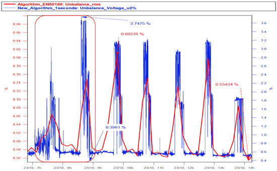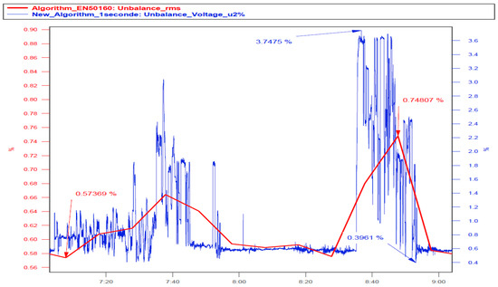 The graphs in red illustrate the voltage imbalance provided by the device based on standard EN 50160, integrated over 10 min, while the graphs in blue represent the curve elaborated by the new algorithm, integrated over 1 s.