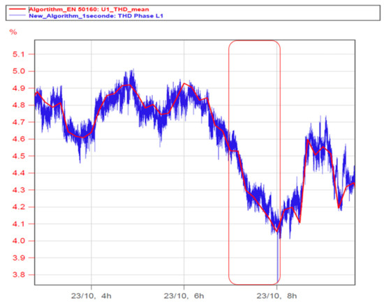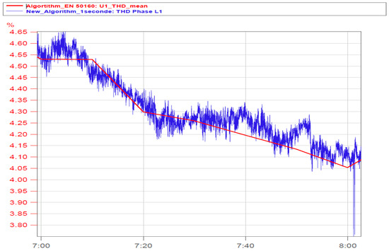 The area framed in red from 07:00 to 08:00 was zoomed in on in Figure 14 to facilitate a thorough examination of the graph’s trends and to confirm the accuracy of the voltage harmonic distortion rate acquisition. This will simplify the determination of the suitable integration period for assessing this parameter, which is based on its time variation. This approach ensures a balance between accuracy and storage.