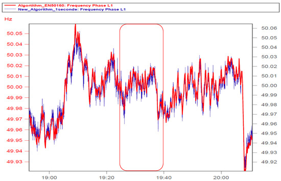 The red box from 19:25 to 19:40 has been zoomed in on Figure 16 to better visualize the trends of the graphs, and also to demonstrate the frequency acquisition capacity of the frequency phase L1 by the proposed solution.