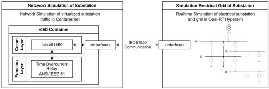 Various considerations have been focused on digital substations and other power supply stations in recent years, such as functional enhancements, flexibility, and IT security [1,2,3,4]. In this case, standardized communication with real-time capabilities plays a major role and is explicitly introduced through IEC 61850. All functions are implemented through communication devices in the form of intelligent electronic devices (IEDs) and realize substation automation. Accordingly, the importance of simulative investigations of the communication infrastructure is constantly increasing, and various modeling approaches are being developed and published [5]. One promising approach is the virtual mapping of the OT infrastructure, or secondary equipment, and its coupling as part of a co-simulation with a power grid simulation to generate physical measurements. In this approach, the components of the communication network are implemented using virtual container instances. The power grid simulation supplies the process information, such as currents and voltages, via internally mapped merging units using IEC 61850 Sampled Values (SVs). Virtual IEDs (vIEDs) therefore receive process information as measured values and can, for example, feed control commands back into the power grid simulation as a protective function in the application. In this way, virtualization can be executed in parallel to the real-time power grid simulation at the same time, and a co-simulation of the substation automation can be established. This approach has already been presented in [6,7].