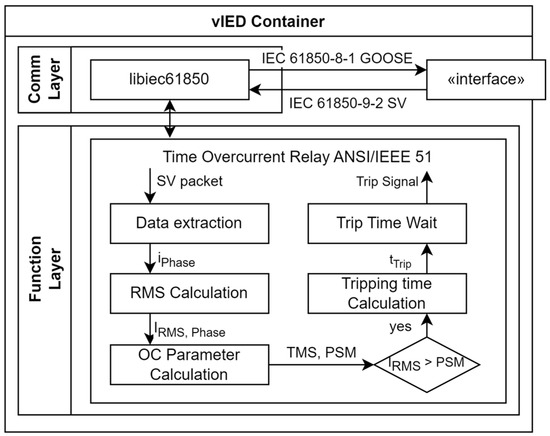 Previous publications, such as [6,7], have mainly focused on the description and development of a virtual testbed system itself. In [4], in particular, the focus is on the development of the testbed in the form of a co-simulation in which virtual IEDs can be placed. This publication aims to present the procedure and an example of a vIED development that can be used in the testbed demonstrated in [4]. The primary objective of this publication is to implement and evaluate a virtualized protection IED within a virtual substation framework. In addition to the communication stack using libiec61850 [13], the focus is on abstracting IED functionalities, including various overcurrent protection schemes, within a containerized environment. To replicate functions such as vIEDs, templates that are as simplified as possible but still valid in terms of function are therefore required, which can be used to reconstruct substation automation in virtualization. This article presents a procedure and an implementation example of a protection IED for this purpose. This paper will show how the communication and function layer can be designed and implemented using open-source libraries based on the design specification for vIEDs from [6,14]. The mapping quality of the function will then be analyzed in Section 3. Therefore, the mapped protection function as a vIED will be compared with a commercial IED of the same protection function regarding the electrical behavior, i.e., the effect in the power grid simulation.
