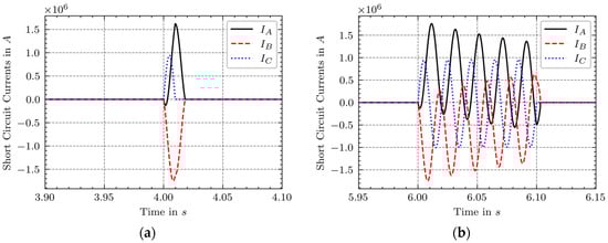 The validation scenario for the described vIED implementations involves a short-circuit event in the simulated three-phase electrical circuit. This typical event was chosen to test the reproduced IED functionality. The three-phase short circuit was generated at different simulation times and different feeders, as shown in Figure 3, to examine the IED’s reaction und protection function individually. This allowed us to evaluate the response of the virtualized protection IEDs separately. Furthermore, this setup allowed for a comparison to be made between the response of the virtualized IEDs and their physical counterparts during a critical event in the power grid. The short circuit to investigate the behavior for the instantaneous overcurrent protection (PIOC) occurs at a simulation time of 4.0 s. For the time overcurrent protection (PTOC), the event starts at 6.0 s. The short-circuit currents are switched off by triggering the vIED protection function, which sends a GOOSE message to the grid simulation.