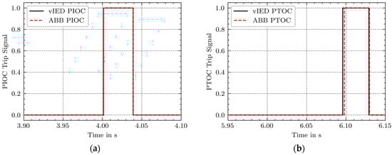 Resulting tripping times for described vIED approach and commercial ABB IED for PIOC (a) and PTOC protection algorithm (b).