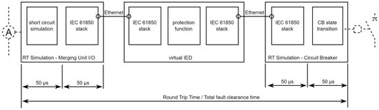 Looking at the various time components in Figure 6, the transmission time between two physical components comes to the fore, which is defined in IEC 61850-5 for various applications and types of criticalities. A maximum permitted transmission time of 3 ms applies here for triggering using GOOSE. Regarding the measured triggering time of the PIOC, the given setup is significantly shorter than this time. In [6,21], the transmission times were examined in more detail using the SDN infrastructure. In particular, [6] shows that the transmission times can be well maintained within the framework of the co-simulations with direct coupling. The same setup with the ABB system has a similarly low transmission time. Overall, the significant undercutting of the upper limit of the transmission time given by IEC 61850-5 can be explained by the direct coupling of the simulation to the protection system without any further intermediate network infrastructure. This can be explained by the fast communication stack used within the power grid simulator. We estimate this with a simple simulation time of 50 µs, as shown in Figure 6.