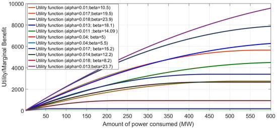 The term indicates the demand at the bus, and parameters and are predetermined and serve to distinguish between different consumers. The utility function for varying values of the utility coefficient is illustrated in Figure 1.