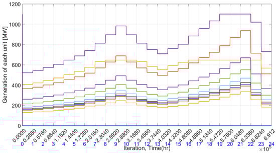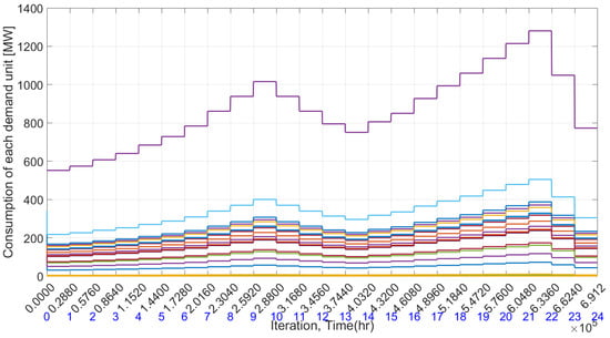 The distributed economic dispatch problem formulation without demand response using the ADMM approach is clearly stated in []. The simulation outcomes depicting the load distribution throughout a 24-h period are illustrated in Figure 4, Figure 5, Figure 6 and Figure 7. Each unit’s load demand has been pre-scheduled for specific periods, and the utility’s obligation is to meet all demanded loads at the most economically advantageous market rate available at any given period. In Figure 4, Figure 5, Figure 6, Figure 7, Figure 8, Figure 9, Figure 10, Figure 11, Figure 12, Figure 13, Figure 14, Figure 15, Figure 16, Figure 17, Figure 18, Figure 19 and Figure 20, presenting in Section 4.2 to Section 4.4, the blue numbers on the x-axis represent the time in hours, while the black numbers indicate the number of iterations.