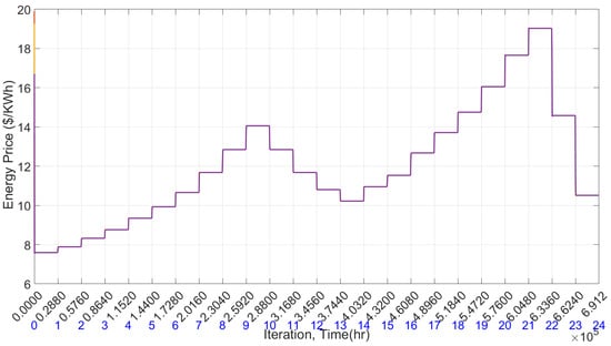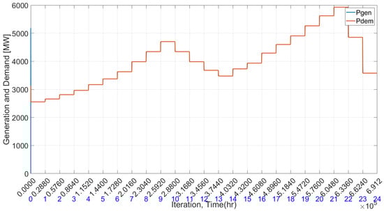 Figure 4 illustrates the optimal generation of each generating unit, with different colored lines representing each unit. The corresponding optimal market energy prices are shown in Figure 5. This price reflects the common consent energy price. Each generating unit adjusts its output to generate power optimally based on this consensus price, ensuring that the total generation matches the demand precisely. The power demand of each load unit over a 24-h period is presented in Figure 6. An increase in demand correlates with a higher market price, while a decrease in demand leads to a lower consensus price, in line with the supply-demand curve. Furthermore, Figure 7 illustrates the total generation and demand, which are perfectly balanced, resulting in zero energy mismatch upon convergence. Two peaks in demand are notable: one at the 9th time period and another at the 21st time period. The utility successfully meets all demands, irrespective of energy prices, which fluctuate between 2455 MW and 5926 MW. The total energy consumption over the day amounts to 96383 Megawatt-hours, with a corresponding cost of $1,219,256. The average cost per Megawatt-hour stands at approximately $12.65.
