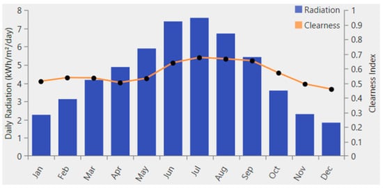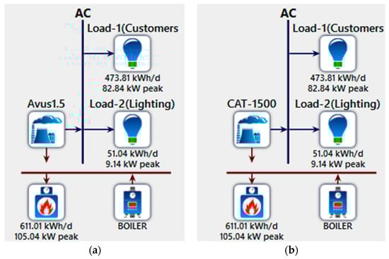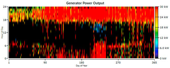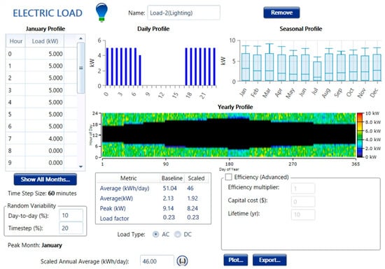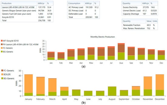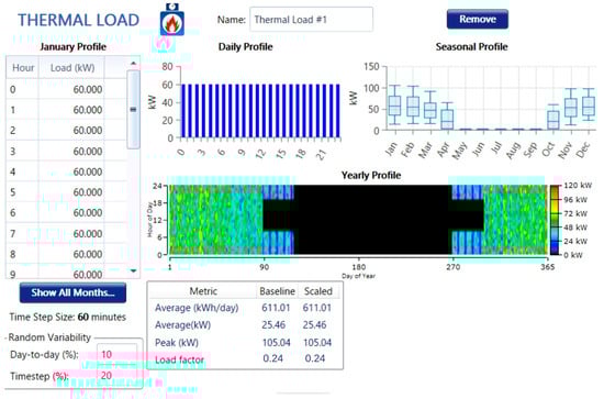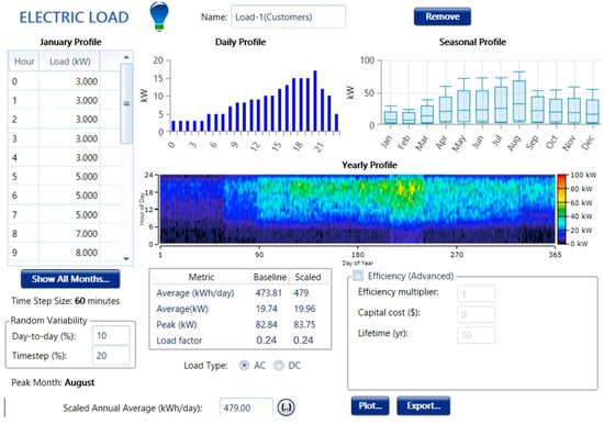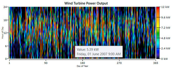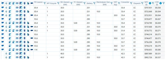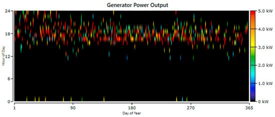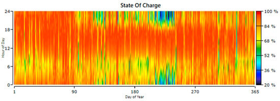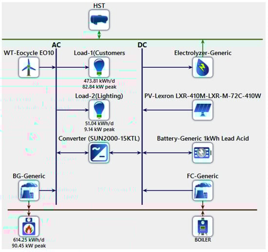 17], an off-grid system based on RESs was designed and optimized using HOMER Pro to meet the heat and electricity needs of a household. The results indicated that a system consisting of a 3 kW WT, a 3.35 kW PV panel, a 2.9 kW FC, a 6 kW BSS, a 4.2 kW electrolyzer, and a 40 kg HTS can meet a household’s electricity and thermal energy demands throughout the year.