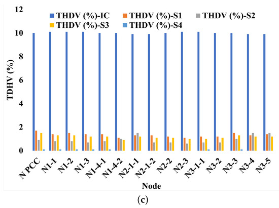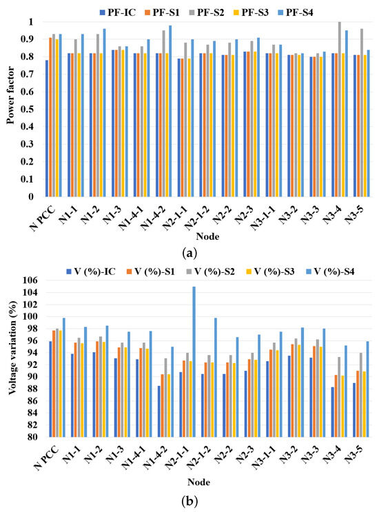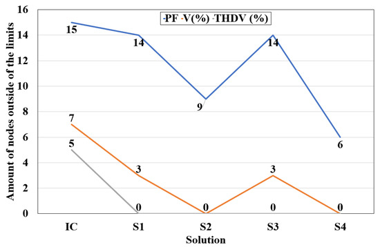 Figure 3 shows that in the IC, all nodes presented low power factors, seven nodes low voltages, and five nodes high harmonics. With S1 and S3 (concentrated), only the PF in the PCC improved, and in three nodes (N1-4-2, N3-4, and N3-5), the low voltage was maintained. With S2 and S4 (distributed), the PF was improved in six and nine nodes, respectively, while voltage variation problems were eliminated in all nodes. Harmonics, for their part, were mitigated when considering the four solutions (S1, S2, S3, and S4), with S4 as the solution with the greatest reduction.