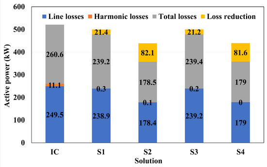 Figure 5 shows the line losses, harmonic losses, total losses, and loss reduction corresponding to the IC and each solution (S1–S4).