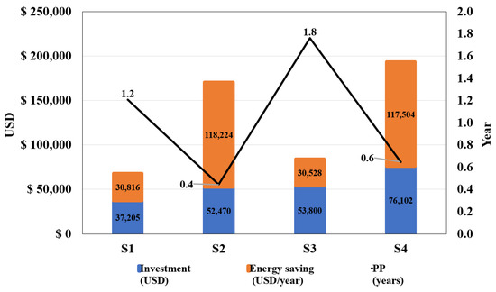 For the economic evaluation of the solutions, the PP was calculated with Equation (8). The term PP refers to the number of years required to recover the original investment (years), CI is the cost of the investment (USD), and AES is the annual energy savings due to electricity (USD/year).