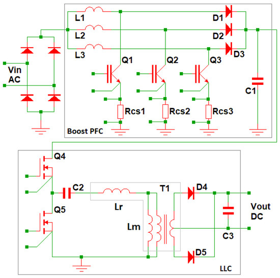 Figure 1 shows the primary circuit of the explored battery charger. This research focuses on two sub-systems: the Boost-PFC DC-DC converter and the LLC DC-DC converter, which operates as a battery charger. As the suggested Kelvin connection benefits apply to the converters’ power parts, control systems and feedback networks are not considered.