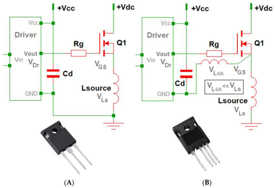 The primary circuits of the standard 3-pin and Kelvin 4-pin TO-247 packages are shown in Figure 2A and Figure 2B, respectively. The main elements are the driver, the gate-drive resistor (Rg), the gate-drive capacitor (Cd), and the parasitic source inductance (Lsource). The same circuit topology and analysis applies to the IGBTs; therefore, they are not presented separately.