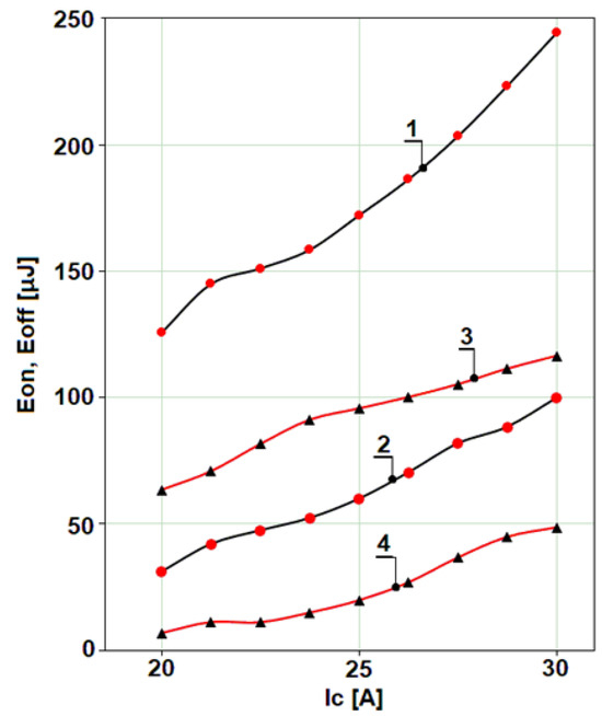 Generally, for Kelvin-connected MOSFETs, the average reduction in E O N is 47.9 % , and that for E O F F is 65.2 % , calculated for the current range of 20 30   A . For the same range, the power loss reduction varies between 8.6   W and 17.9   W (Figure 4, diagram 3), which gives a 12.5   W reduction. The results were calculated for both packages at a switching frequency of 100   k H z .