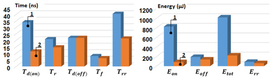 The statistical results can be supported by concrete data for specific transistors; the main datasheet parameters of the two packages are compared in Table 1. The data presented for t d ( o n ) delay on, t r rise, t d ( o f f ) delay off, t f fall, and t r r reverse-recovery times determine the energy values E o n , E o f f , total energy E t o t , and reverse-recovery energy E r r . The comparison is visualised graphically in Figure 7 for MOSFETs and in Figure 8 for IGBTs. For the transistors considered, the total energy is reduced for the 4-pin Kelvin-connected package MOSFET by 78.2 % and, for an IGBT in the same package, by 25 % .