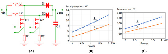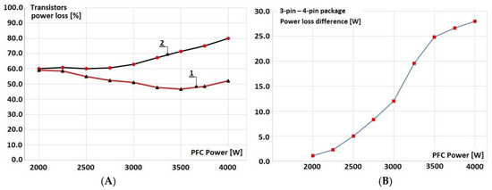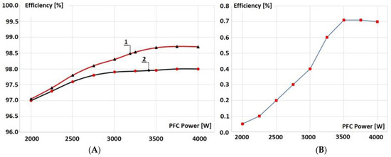 Figure 23. The efficiency of the Boost PFC, estimated for the transistors Q1, Q2, and Q3, Figure 1: (A) 4-pin (2) and 3-pin (1); (B) the efficiency difference between diagrams 1 and 2.
