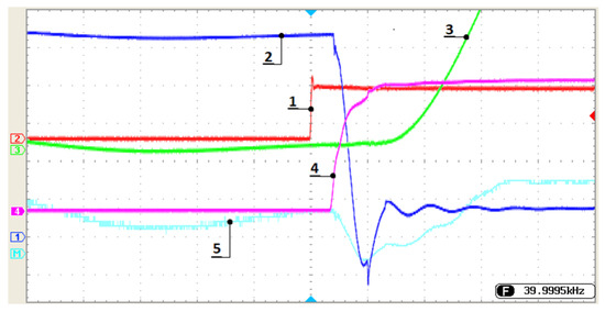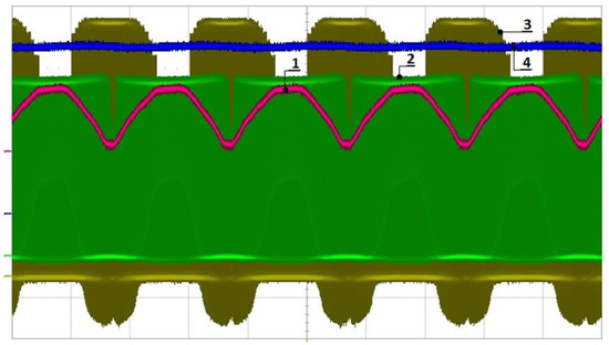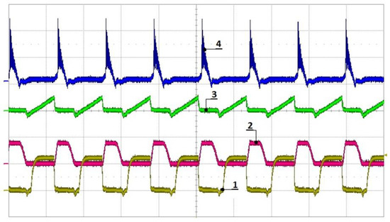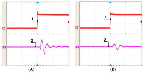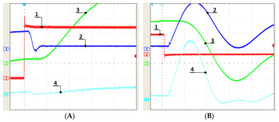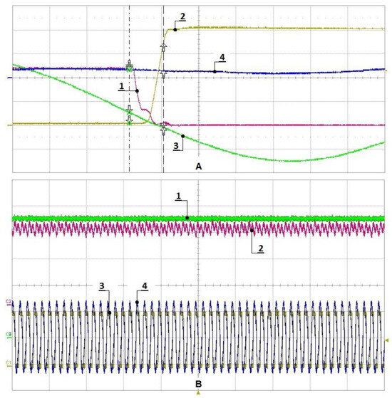 Figure 21. LLC output voltage and current. (A) (1) Low-side gate drain-to-source voltage; (2) high-side drain-to-source voltage; (3) voltage over the resonant capacitor, ZVS; (4) secondary-side output current. (B) (1) Output voltage; (2) responses in the output current; (3) primary-side MOSFET switching; (4) primary-side voltage at the middle point at the resonant frequency.
