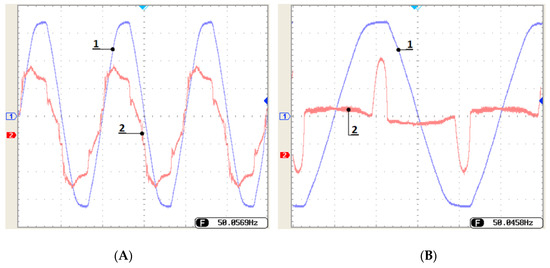 Figure 19. Input battery charger voltage (1) and current (2). Operation with PFC (A) and without PFC (B).