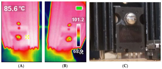 Figure 24. Thermal images of TO-247 (A) 4-pin Kelvin-connected and (B) 3-pin IGBTs; (C) 4-pin Kelvin-connected TO-247 package connected to a heat sink.