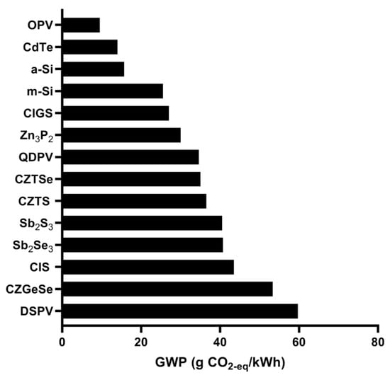 The two most prevalent thin-film photovoltaic technologies, specifically those constructed from amorphous silicon and cadmium telluride (CdTe), exhibit significantly reduced global warming potential (GWP) in terms of greenhouse gas emissions compared to monocrystalline silicon photovoltaics. GWP quantifies the amount of energy that the emissions of a gas absorb over a specified timeframe in relation to the emissions of one ton of CO2. Amorphous silicon panels demonstrate a GWP approximately one-third lower, while CdTe panels show a GWP nearly one-half lower than monocrystalline silicon [55,57]. On a positive note, organic photovoltaics boast the lowest GWP among various thin-film photovoltaic technologies, with GWP values that are over 60% lower than those of monocrystalline silicon [58].