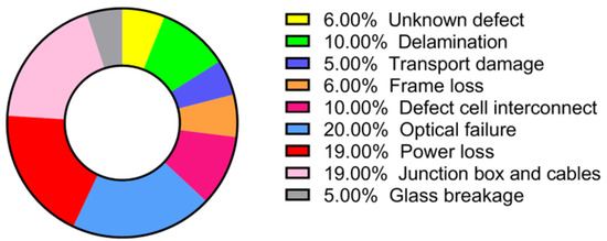 Novel solar panels sometimes exhibit minor defects, such as small erosions (0.5–5%), poor design, and manufacturing flaws [66], as shown in Figure 2. Other panel failures are mainly due to issues with electrical components like charge controllers, fuse and junction boxes, and cabling [67,68]. Initially, solar panels faced problems with degrading anti-reflective coatings, which were made of colorless ethylene vinyl acetate (EVA) and applied to the glass surface, as well as incoherent cracked solar cells [69]. After more than ten years of use, failures were often caused by repeated wind or snow load cycles and temperature changes, leading to degradation, glass breakage, and burst frames [70]. Research has shown that 40% of PV panel failures were due to microscopic cracks [70]. The production of thin cell panels began in 2008, and these types of failures have been most common in these panels [70]. Various methods are employed to address and repair panels with defects.
