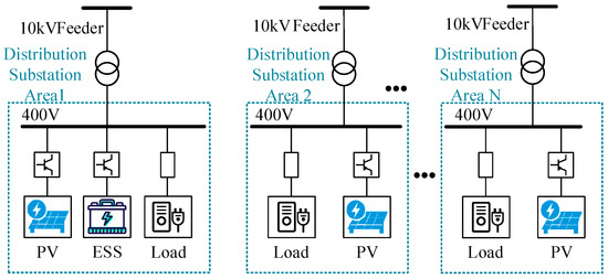 With the key progress of green energy low-carbon transformation, a large amount of distributed generation (DG) needs wide access to the distribution network. The future Active Distribution Network (ADN) is anticipated to transition from a traditional unidirectional radial configuration to a bidirectional active network. The control mode will be changed from centralized dispatch to hierarchical and clustered control, constituting a hybrid AC–DC distribution network with medium and low voltage interaction and multi-station interconnection. However, due to the large random volatility and strong uncertainty of DG output, which is typically represented by photovoltaic (PV) energy, leading to prominent problems such as voltage overruns and power imbalance in the distribution network, the challenge of new energy consumption is highlighted [1]. Therefore, fully utilizing adjustable resources to implement autonomous operation at the distribution level and collaborative optimization control across multiple distribution areas has become one of the effective means of addressing the aforementioned issues.