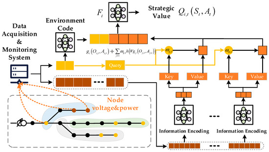 The observation–action vector of the distribution substation area agent is encoded into the initial input of the value network, with an initial set of attention weights assigned. The attention network continuously adjusts the attention weight coefficients assigned to each agent during training, enabling the value network to dynamically assess each substation’s contribution to the optimization objective. Based on the adjusted attention weights, the policy network is then guided in making strategy corrections. As shown in Figure 3, for any intelligent agent i, the input to its AECN can be divided into two parts: one part is the environmental information , which represents the agent’s observation-action combination encoding of the distribution network environment, and the other part is the attention information , which encodes the observation–action combinations of the other agents within the cluster: