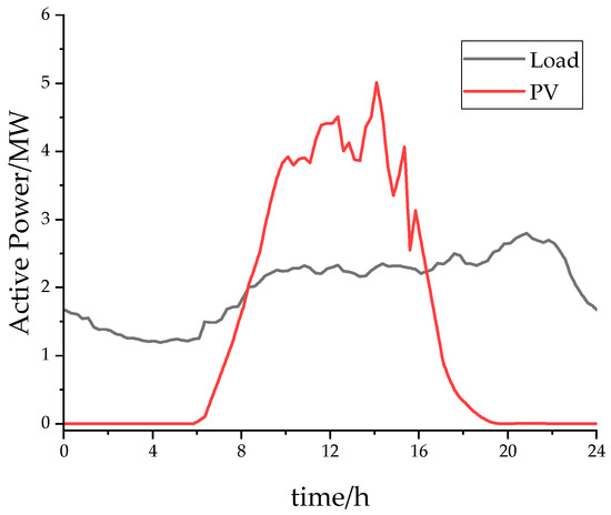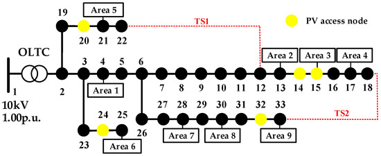 To validate the effectiveness of the proposed algorithm, simulation experiments were conducted using an improved IEEE 33-bus system with multiple substations. The system’s base capacity is 10 MVA, and the voltage reference value is 12.66 kV. The voltage safety limits were set to 0.95–1.05 p.u. in this study. All buses in the test system are connected to loads, and photovoltaic systems are connected to buses 14, 15, 20, 24, and 32. The locations of the substations 1–9 connected to the distribution network are shown in Figure 4. The daily load and PV active power output during the test day are illustrated in Figure 5.