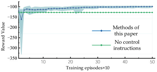 As can be seen from Figure 6, the method proposed in this paper enters the experience accumulation phase during the early stage of training, with the reward values fluctuating significantly. As the training progresses, the agent continuously learns better control strategies from the experience replay pool. After the 50th iteration, the reward gradually increases, and the training converges after 300 iterations.