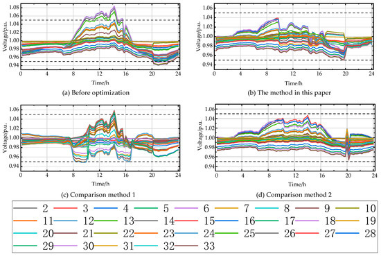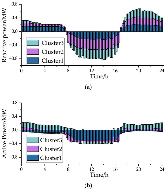 Figure 7 illustrates the power output of the three clusters throughout the test day. From Figure 7a, it can be seen that each cluster absorbs reactive power between 08:00 and 16:00, when the PV output is high, and provides reactive power during the remaining hours. Cluster 1, with nodes located at the front end of the distribution network, exhibits lower sensitivity to voltage variations compared to the other two clusters. Therefore, it requires less reactive power support at noon, with a daily average reactive power output of 165.99 kVar. Some nodes in Clusters 2 and 3, located at the feeder ends, are more sensitive to voltage changes and require more reactive power support, with daily average reactive power outputs of 146.71 kVar and 186.75 kVar, respectively. Figure 7b shows that the active power regulation has a smaller impact on the distribution network voltage compared to reactive power regulation. Active power is primarily provided for voltage support during the day (08:00–17:00), with daily average active power outputs of 134.89 kW, 50.85 kW, and 104.7 kW for the three clusters, respectively.