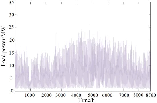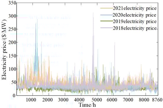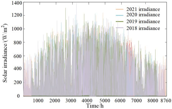 Figure 2 illustrates the annual solar irradiance data from 2018 to 2021 for users with optical storage at a specific location. Figure 3 presents the average annual market electricity price over the same period, calculated as the average of the four-year prices. Figure 4 depicts the annual average load data. The system considered in this study includes a PV system as the primary renewable energy source in conjunction with a BESS. The charging period for the BESS is from 23:00 to 9:00 the next day, aligning with lower electricity prices during off-peak hours and the absence of PV generation at night. The discharging period, from 9:00 to 23:00, is designed to coincide with daytime hours when PV generation is active, allowing the BESS to store excess PV power and discharge it during periods of high electricity demand or reduced PV output. This schedule reflects a load-shifting strategy aimed at optimizing PV utilization, minimizing grid reliance, and achieving economic benefits through electricity price arbitrage.