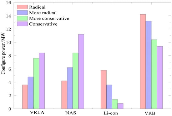 The hybrid algorithm proposed in this article is programmed and solved using GAMS software. The configuration of each battery under different risk coefficients is shown in Table 5.