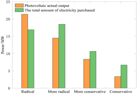 Figure 5 and Figure 6 show that investors are willing to take higher risks for higher returns when the risk factor is low. In this scenario, with better returns and higher operational risks, VRB and Li-con become the main batteries in the configuration scheme. Due to the performance risk and volatility of PV output, it is important to carefully consider battery selection. Under this scheme, the source charge often experiences an imbalance, requiring the purchase of additional power from the market to maintain a balance between supply and demand. As a result, the daily PV output and the amount of power purchased from the market are both high. On the other hand, as the risk factor increases and the investment strategy becomes more conservative, VRLA and NAS batteries become the main power sources due to their maturity. The reliable charging and discharging of the batteries, along with lower PV output and market-traded power, improve the source–load balance under this scenario, resulting in lower operational risk.