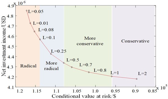 Under different risk coefficients, the effective frontier curve of the income from the allocation plan and the conditional risk value are shown in Figure 7: