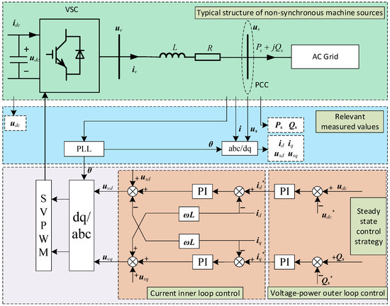 N-SMSs are connected to the grid through power electronic devices and can be classified based on their level of grid isolation. Full-power inverter-based sources, represented by photovoltaic systems and permanent-magnet direct-drive wind turbines, and partial-power inverter-based sources, represented by doubly fed induction generators, are the two main categories. Based on grid connection control strategies, they can be divided into grid-following (GFL) and grid-forming (GFM) types. Similar to synchronous machines, they can also be classified according to node types, such as PV, PQ, and Vθ connections. Since the SCC of N-SMSs is related to the control strategy during faults, this paper introduces the grid-following control strategy of full-power inverter-based sources as an example. The grid-connected inverter and its control system are shown in Figure 1, which will be described in detail below.